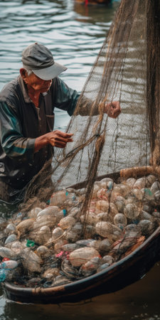 Fisherman encountering a fishing net filled with plastic trash. Vertical banner