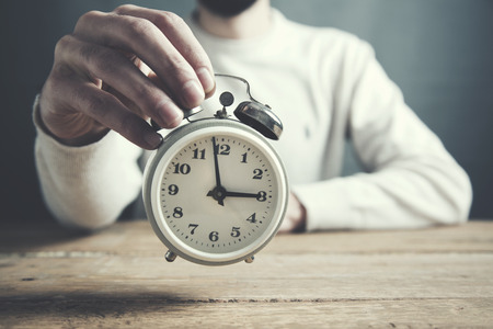 Hurry up, its time to act, concept. A mans hand holds a vintage alarm clock, a photo on a blue background