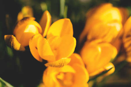 Yellow crocus flowers in the garden on a spring sunny day close up. Beautiful nature backdrop for seasonal cards, blogs and web design. Selective focus