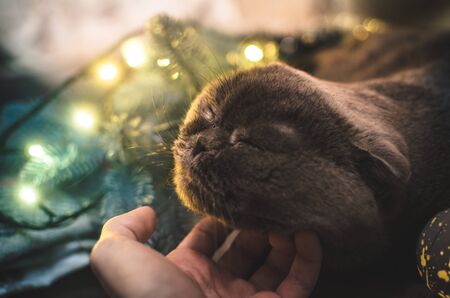 A cute Scottish fold cat is stroking against the background of a garland in a cozy home Christmas atmosphere
