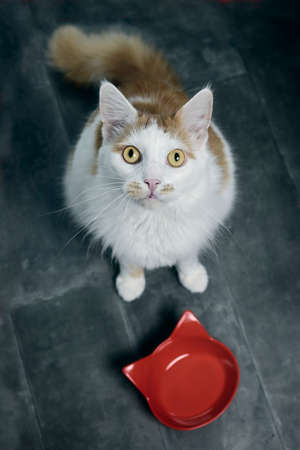 High angle view of a cute longhair cat sitting next to emty feeding dish and looking up at camera.