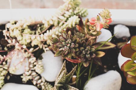 Rectangular arrangement of succulents, cactus succulents in a planter, above view, toning.