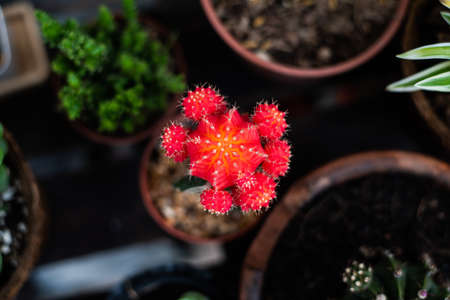 Cactus and succulent plants in many small pots on a farm under sunlight. Modern natural home miniature green corner decoration.