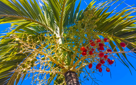 Beautiful tropical palm tree palms trees with red areca betel nuts in Playa del Carmen Quintana Roo Mexico.