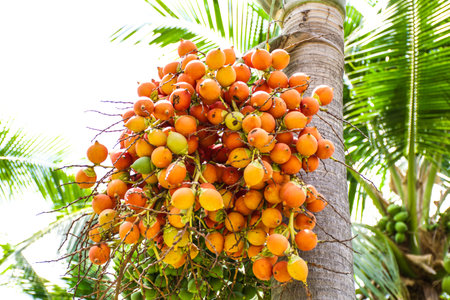 Areca nuts on a palm tree in a park. Nature in the tropics.