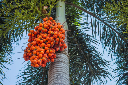 Areca catechu (Areca nut palm, Betel Nuts) ; showing produce on high tree. The ripe fruits, round, orange. All bunch into large clustered, hanging down. natural sunlight.