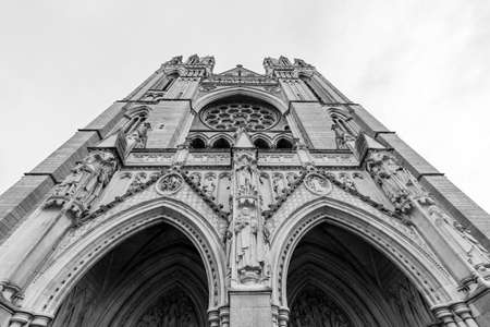 Facade of Cathedral of Saint Mary of the Assumption. Marble Gothic church with Saint Mary sculpture in the front.