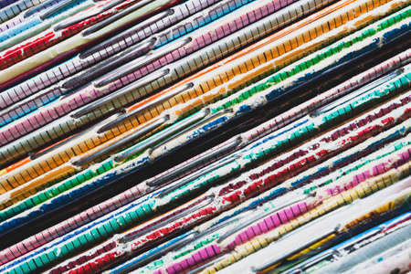Stack of old magazines. pile of retro newspapers. vintage journals lie on top of each other. colorful background from the printed publications