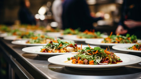 gourmet catering services, elegantly crafted gourmet dishes by top chefs for a high-end event catering menu highlighting culinary skill and innovation
