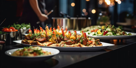 gourmet catering art, exquisite gourmet dishes crafted by renowned chefs for an upscale event catering menu, highlighting culinary mastery and innovation