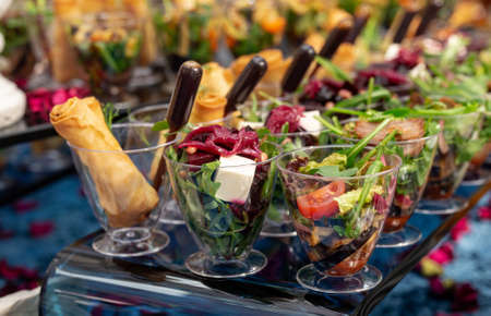 salad in a small glass. catering services for the banquet. convenient small snacks.