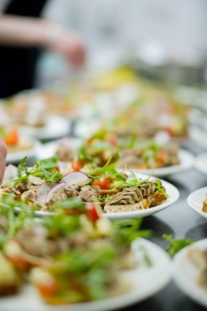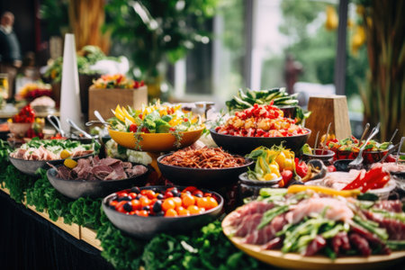 catering wedding buffet food indoor in luxury restaurant with meat and vegetables