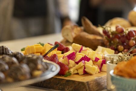 breakfast party buffet with cheese, breads fruits snacks on wooden board and a blurred with people