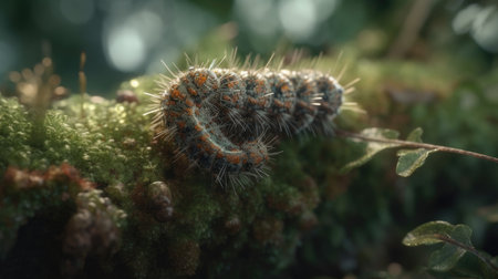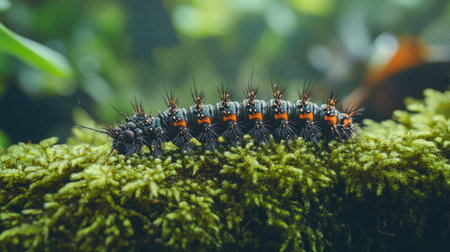 This captivating image showcases a vibrant caterpillar delicately crawling on lush green moss in a serene forest environment, revealing stunning details.