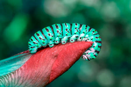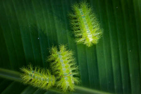 Caterpillar of the butterfly on green leaf with bokeh background