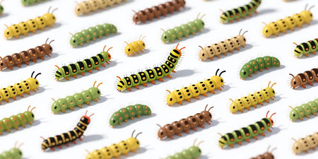 A repeating pattern of various caterpillars in different colors and designs, including green, yellow, brown, and black with spots and stripes on a white background.