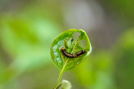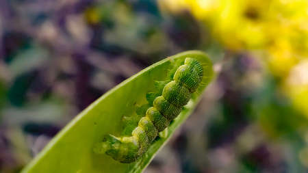 Caterpillar of the Lepidoptera on a green leaf