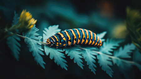A vibrant caterpillar resting on a green plant with delicate leaves, showcasing its unique patterns and colors
