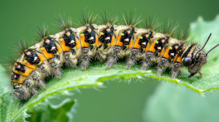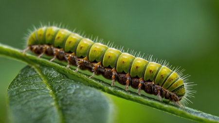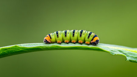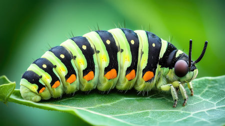 A close-up of a caterpillar munching on a green leaf, with vibrant colors and textures, showcasing the life cycle of insects and their role in nature.
