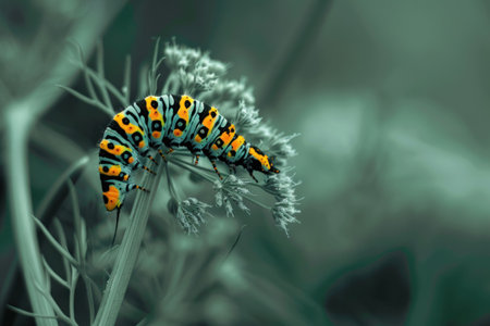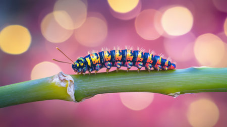 A striking and vibrant caterpillar gently crawls on a bright green stem, set against a softly blurred bokeh background. Ideal for nature lovers.