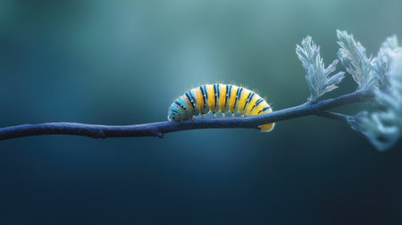 A bright blue and yellow caterpillar delicately crawls along a thin branch, showcasing intricate details against a dreamy blurred background, revealing the beauty of nature.