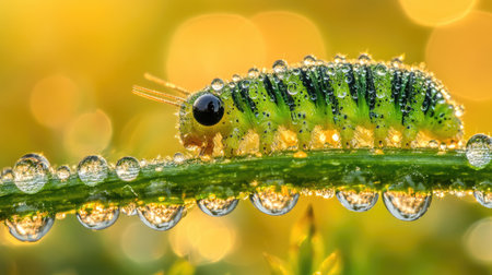 This stunning macro image showcases a vibrant green caterpillar glistening with dew drops, perched on a leaf against a softly blurred bokeh background.