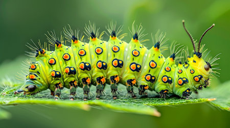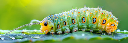 Colorful caterpillar on green leaf with space for custom text banner, nature background