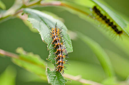 black caterpillars on green leaves in the meadow