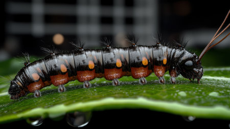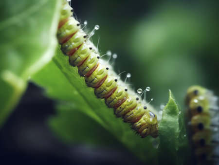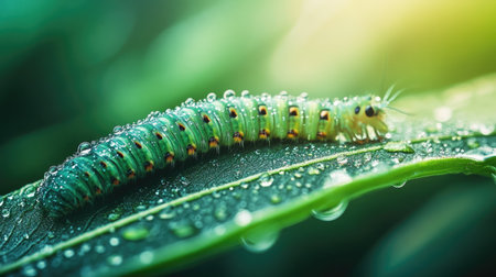 A vibrant green caterpillar rests on a leaf, adorned with glistening water droplets. This macro shot captures the beauty of nature's tiny creatures in a serene environment.