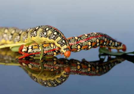 A two caterpillar of Hyles euphorbiae (spurge hawk-moth) fighting on the hood of my car. close up
