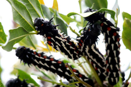 Ugly black spiny caterpillars eating green leaves on a tree
