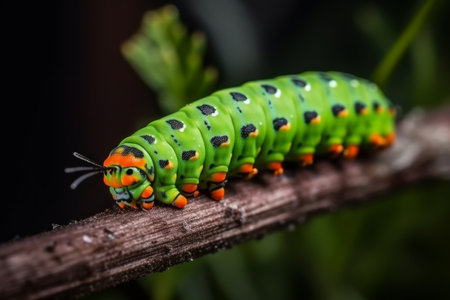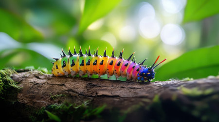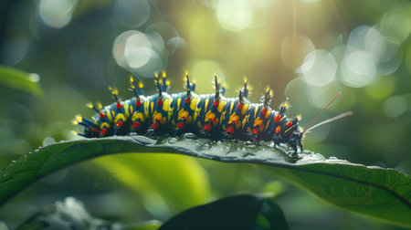Multi colored caterpillar crawls on green plant leaf generated by artificial intelligence