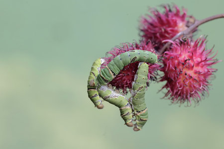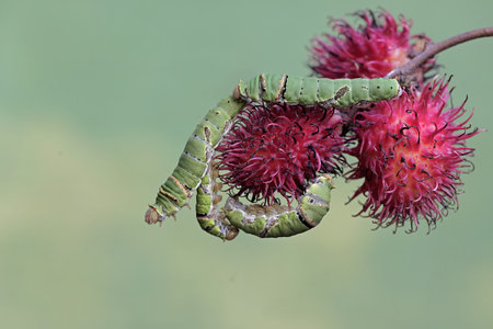 This mesmerizing close-up captures a green caterpillar resting on fresh green leaves, showcasing nature's intricate details and the beauty of transformation.