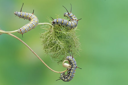 Macro shot of a monarch caterpillar's striped green and black body, showcasing its transformation into a butterfly.