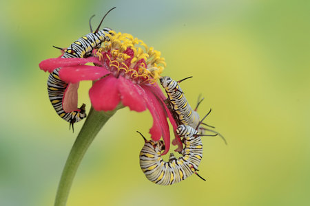 butterfly larva on zinnia flower in the garden
