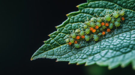 A leaf with small, colorful insects like aphids or beetles clustered on it, highlighting their tiny size and the texture of the leaf they are on.