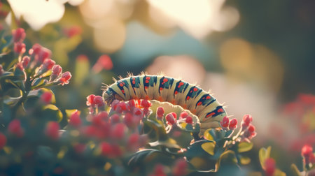 A vivid close-up of a colorful caterpillar crawling on pink flower buds, capturing the essence of nature and wildlife in a serene garden setting.
