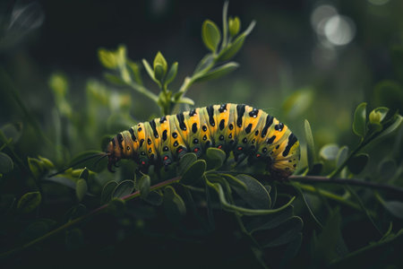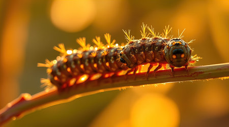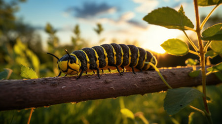 a black and yellow caterpillar crawls gracefully through a vibrant green field, bathed in the enchanting glow of golden light. this captivating scene combines elements of vray tracing, light indigo, and amber hues. the intricate details of this insect's form tell a colorful story, reminiscent of a skilled wood sculptor's work. mythological references add an extra layer of intrigue to this mesmerizing composition. ai generated