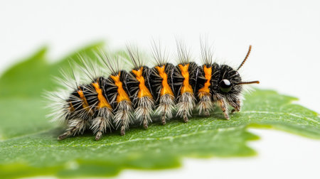 A stunning close-up of a furry caterpillar resting on a green leaf, showcasing its striking orange and black stripes, perfect for nature enthusiasts.