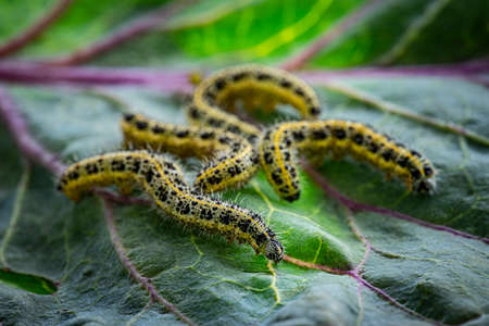 Cabbage caterpillars on a green eaten cabbage leaf
