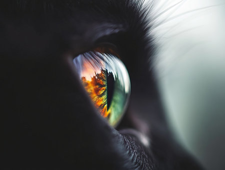 A detailed perspective of a cat's eye showcases its intricate features while capturing the beautiful hues of sunset light reflecting within.