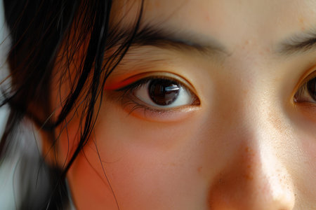 Close-up of enchanting eyes with reflective nature scene and delicate hair strands Young Women Asian