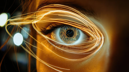 A striking close-up of a human eye enhanced with dynamic light trails, showcasing vibrant colors and intricate details, perfect for artistic projects and creativity.