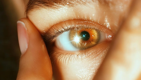 A detailed close-up of a human eye with reflections of lights and surroundings, highlighting intricate patterns and colors.