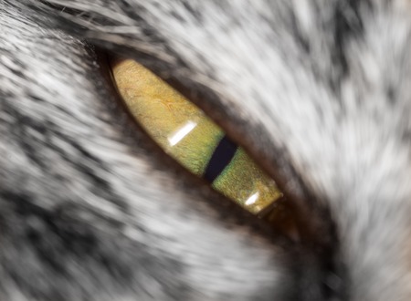 Macro close-up of grey fury cats green eye with narrow pupil