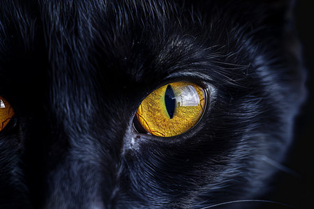 Close up of a black cat's eye with yellow eyes on black background