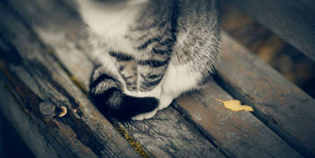 Cat paws close-up. Homeless street cat is sitting on a bench in the fall. A tabby cat on a bench.
