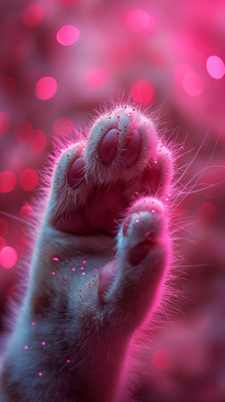 Cat's paw with sparkles on pink background. Cute pet close-up concept.