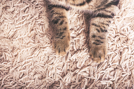 Cat paw on brown carpet background Brown purebred abessin cat. Сoncept of comfort and peace. Pet at home.