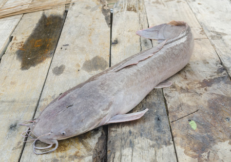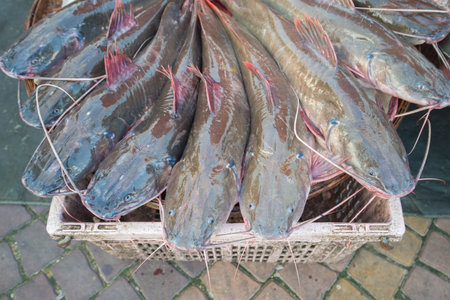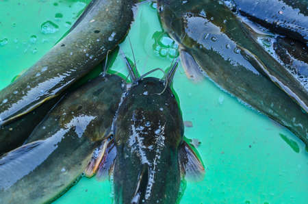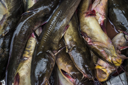 Live cat fish on a market stall. Closeup live cat fish on the market.